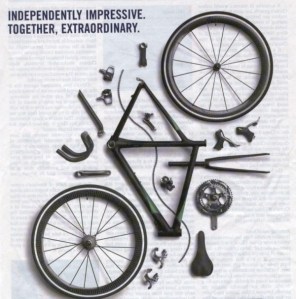 The first is a picture of a bicycle and all its parts. The parts are impressive on their own but the bike only functions extraordinarily when they are working together as a team. I like this metaphor for organizations.